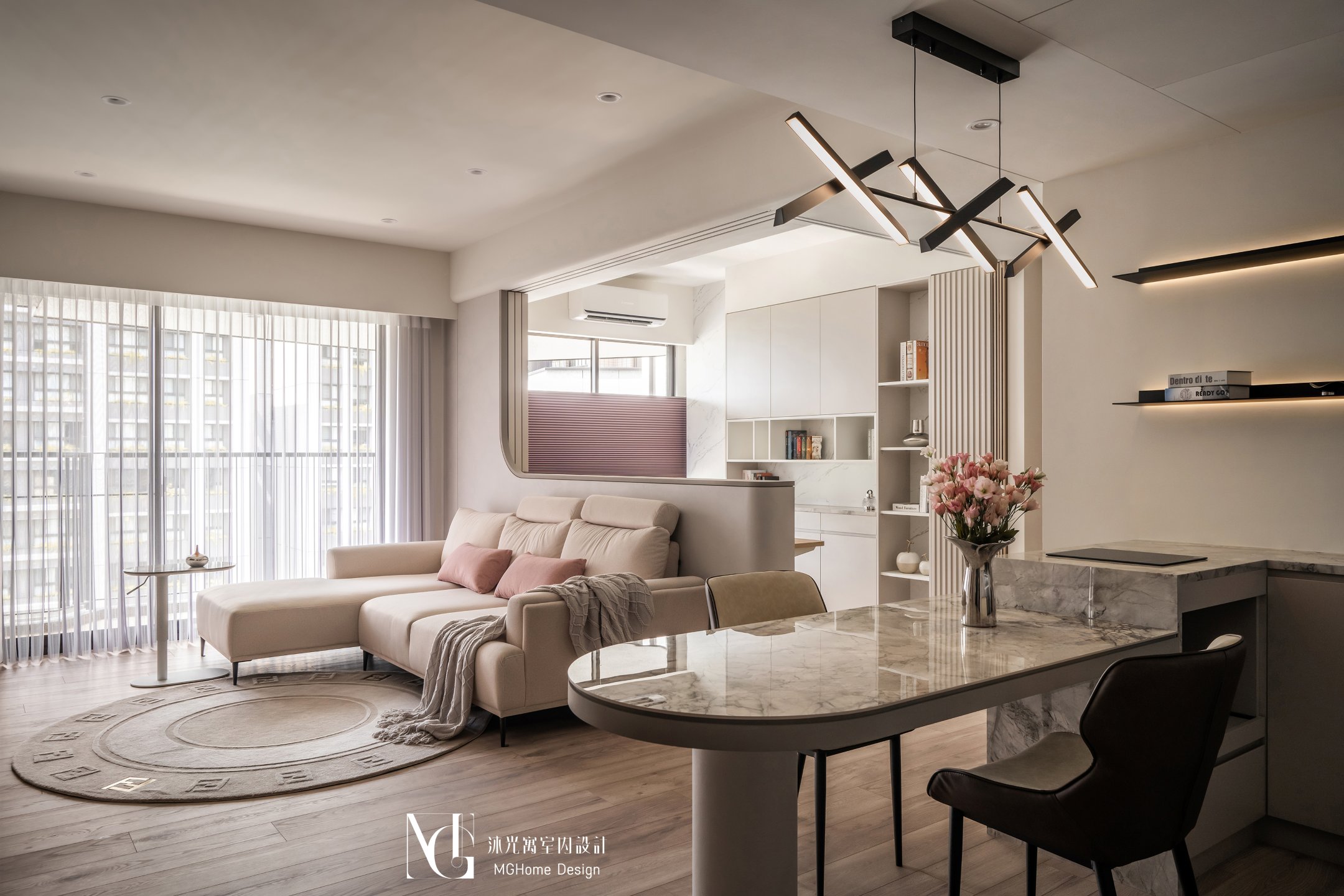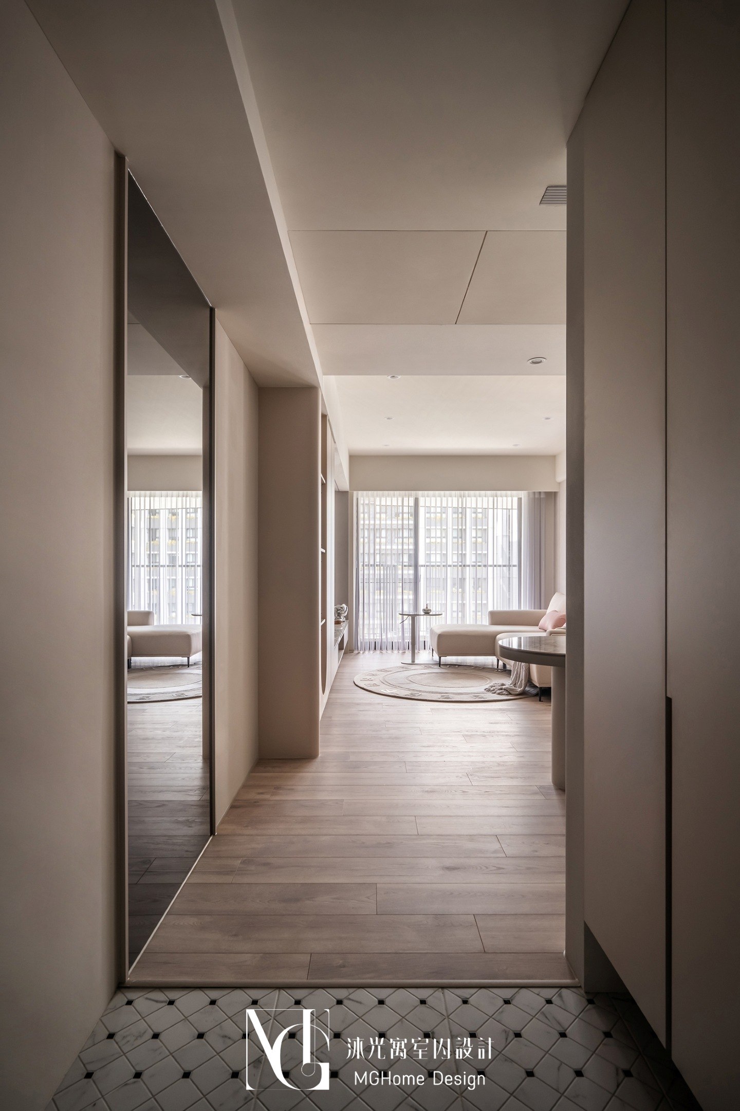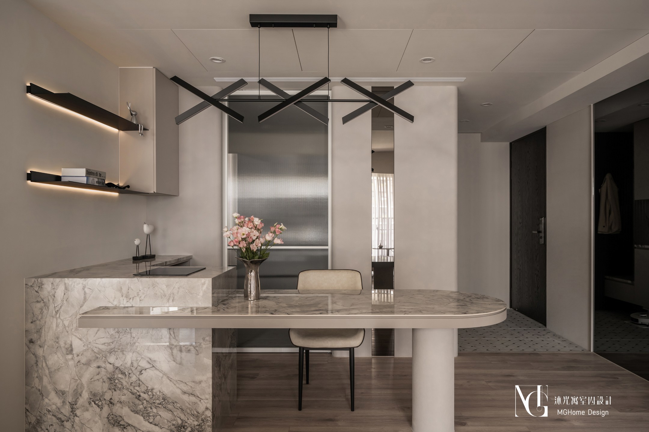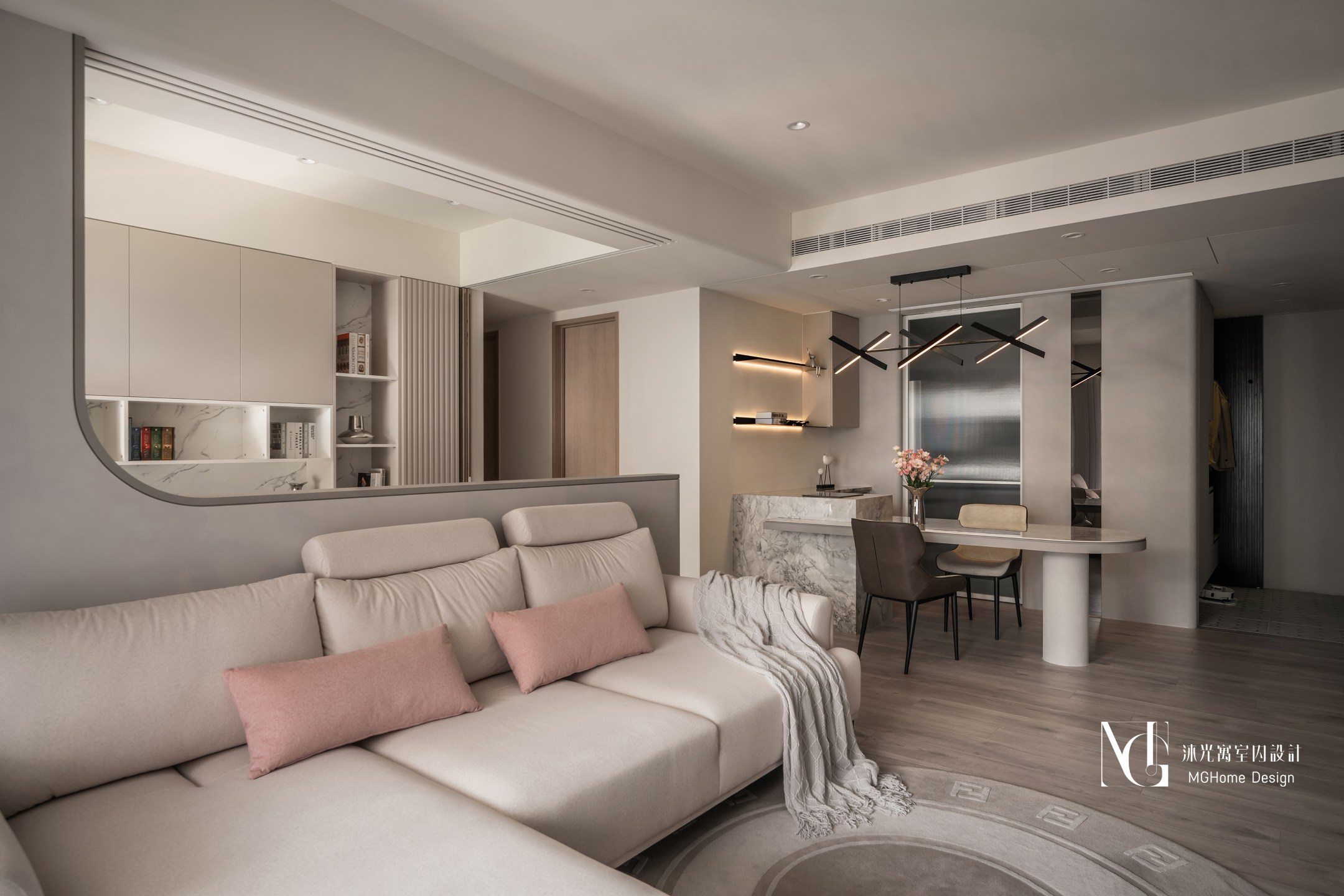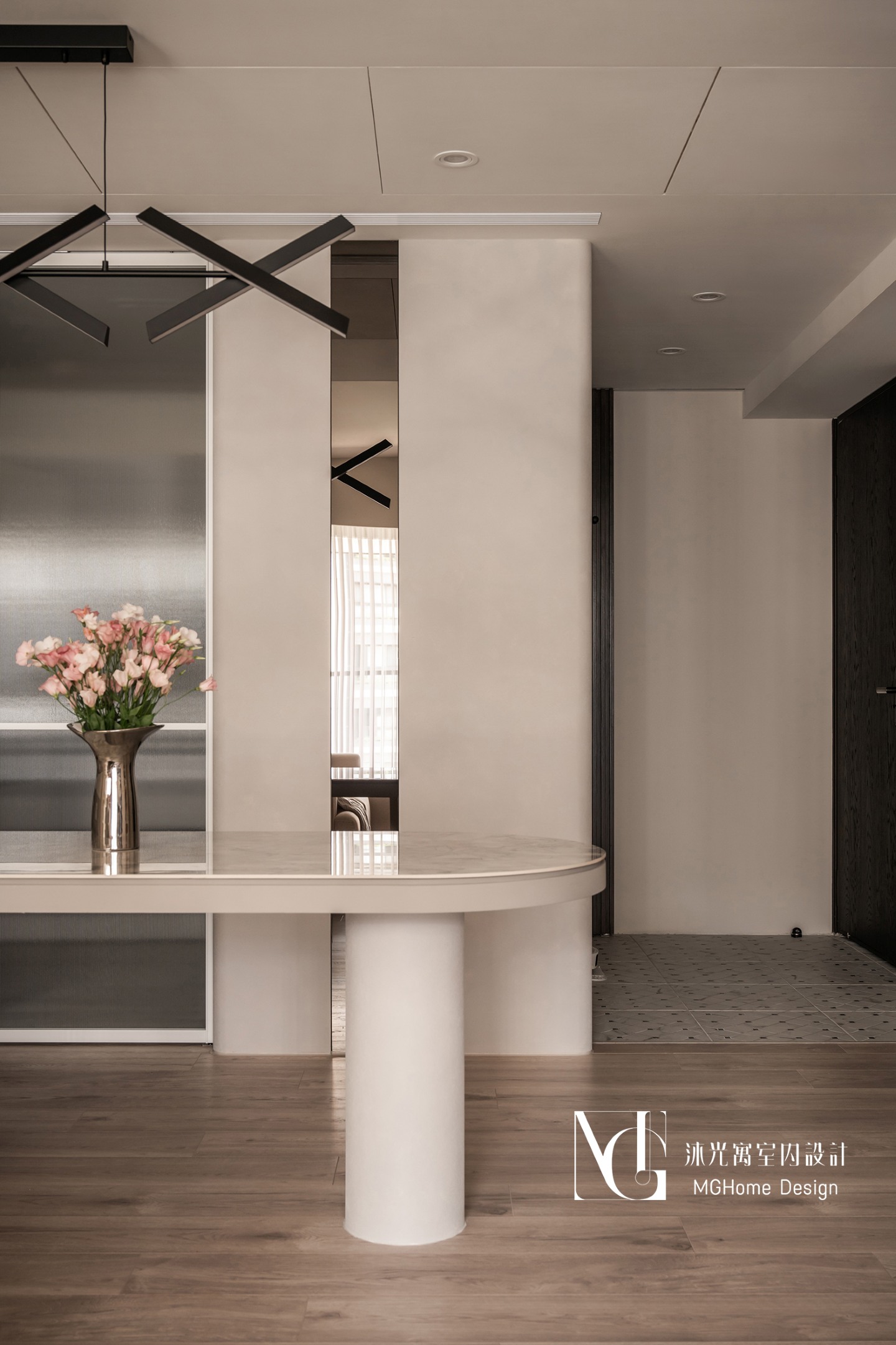 玄關地磚為了符合整體設計更換為帶有石紋的法式磚,並與壁面的薄板相互呼應,全室的奶油色調讓回到家的業主有種放鬆的感覺,而搭配薄板與反射的鏡面及鍍鈦,提升了空間的精緻感;L型的中島餐桌增加了電器的收納也讓餐廳不再單調,適合的主燈既配合整體風格也可在生活中依需求調整;展示區域加上了弧形與條燈效果成為了記錄生活點滴的絕佳位置。