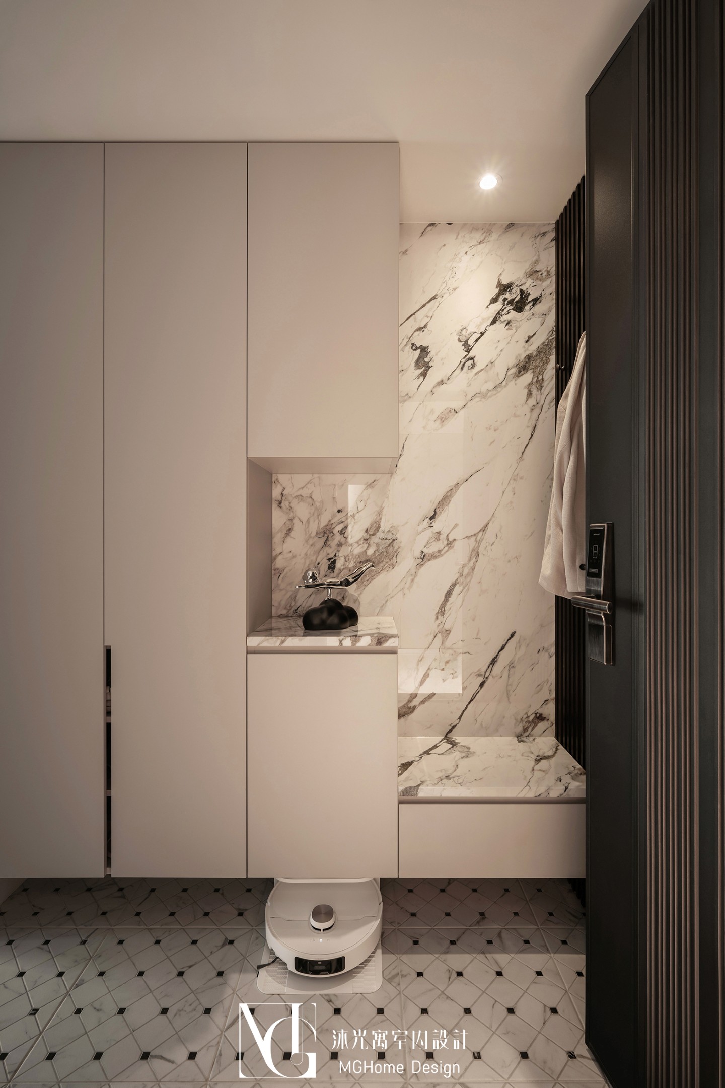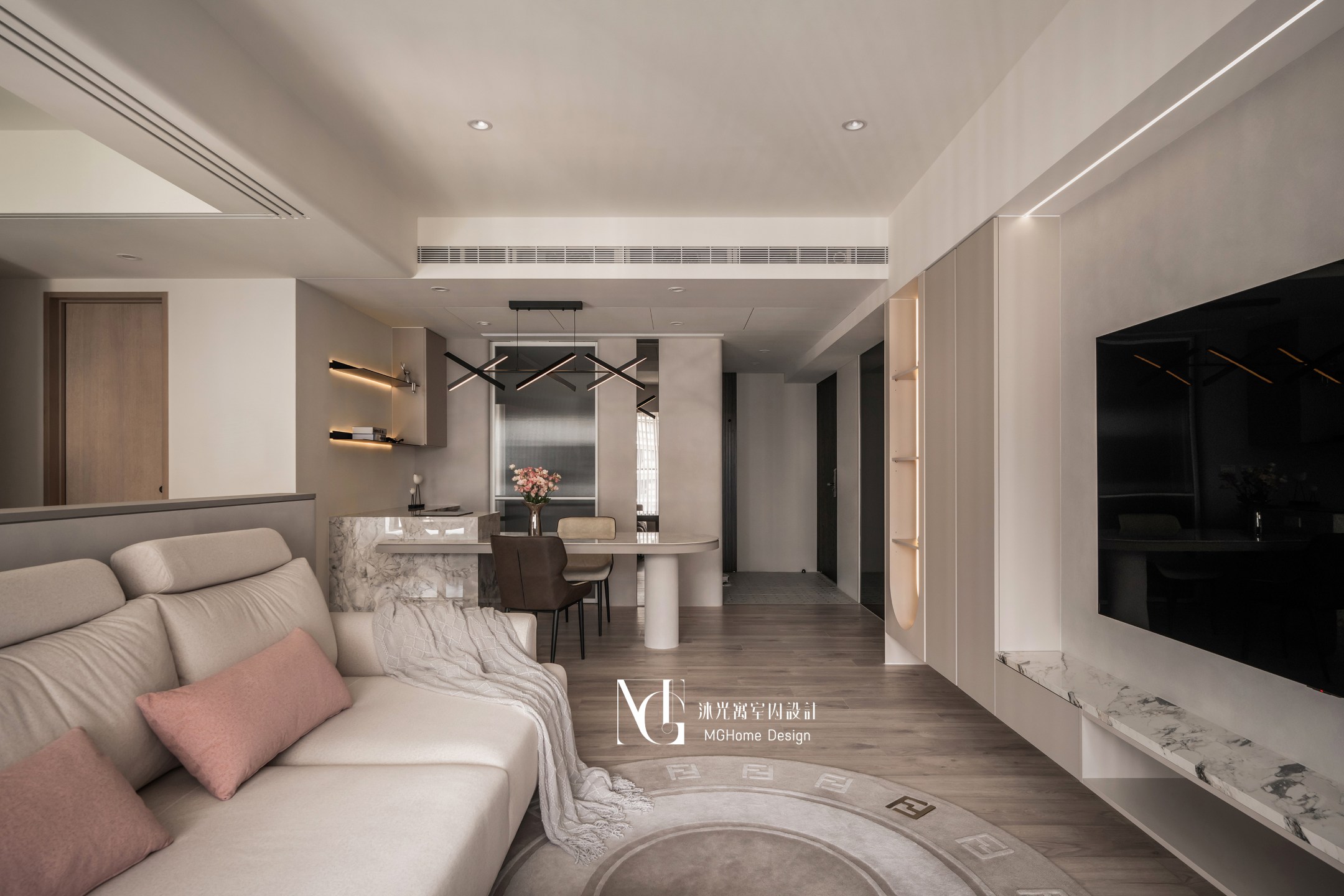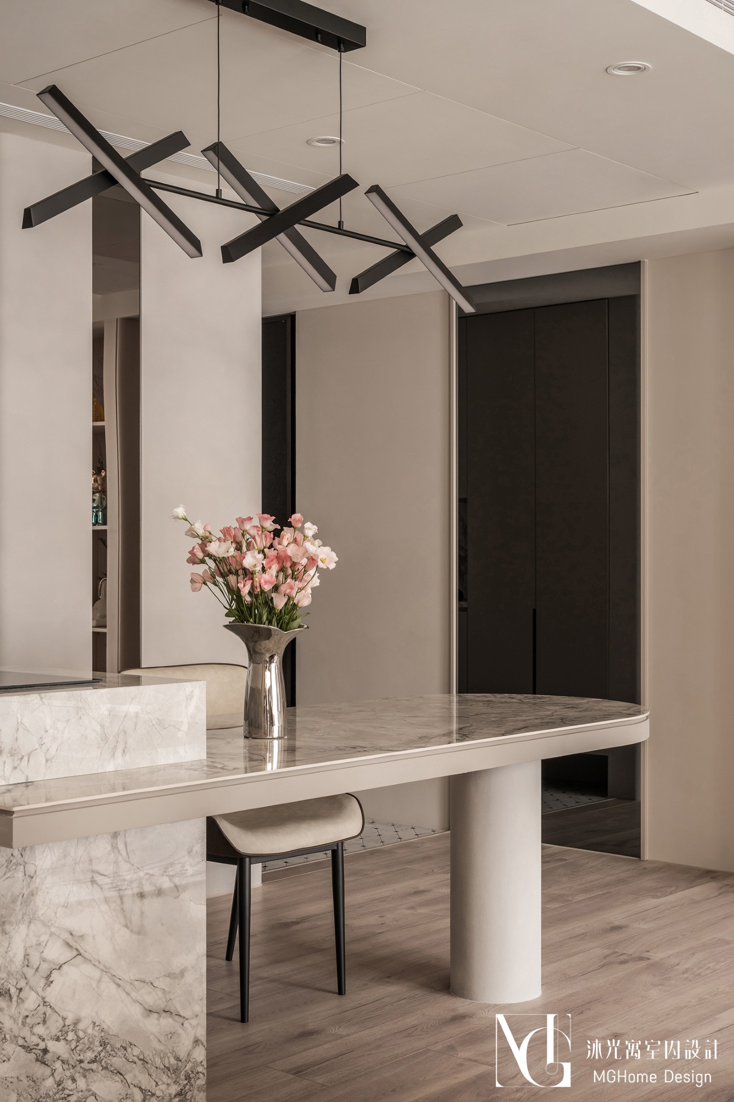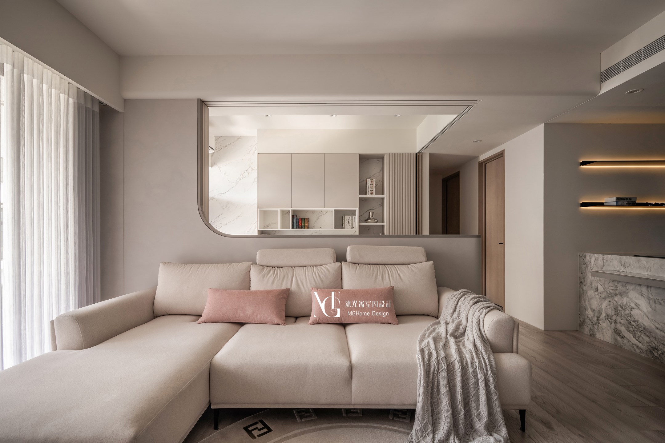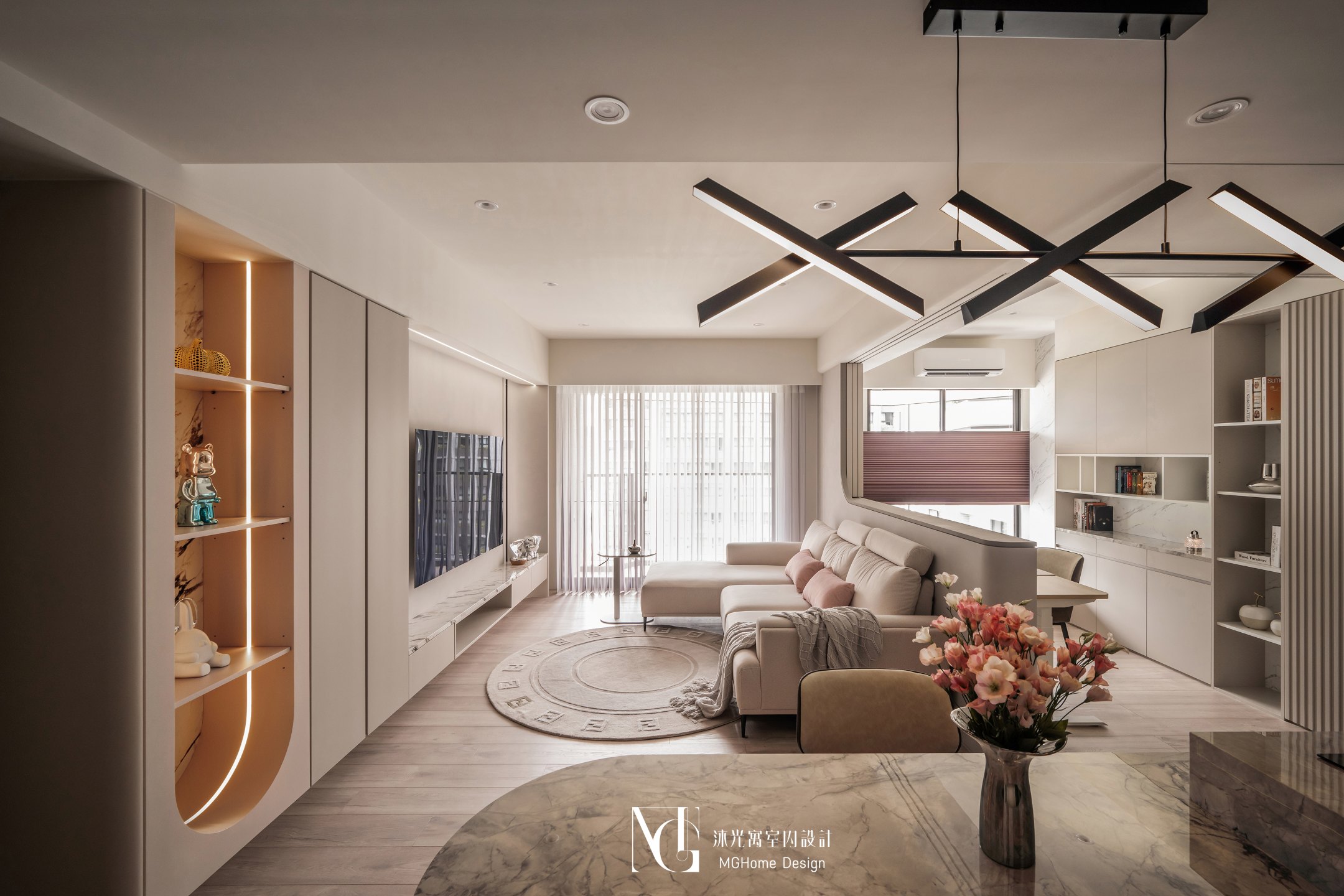 玄關地磚為了符合整體設計更換為帶有石紋的法式磚,並與壁面的薄板相互呼應,全室的奶油色調讓回到家的業主有種放鬆的感覺,而搭配薄板與反射的鏡面及鍍鈦,提升了空間的精緻感;L型的中島餐桌增加了電器的收納也讓餐廳不再單調,適合的主燈既配合整體風格也可在生活中依需求調整;展示區域加上了弧形與條燈效果成為了記錄生活點滴的絕佳位置。