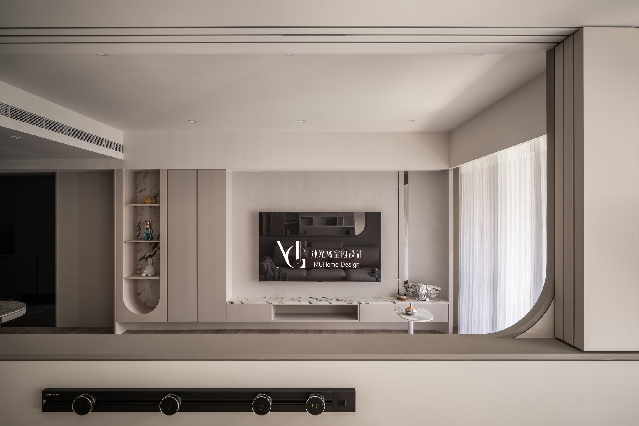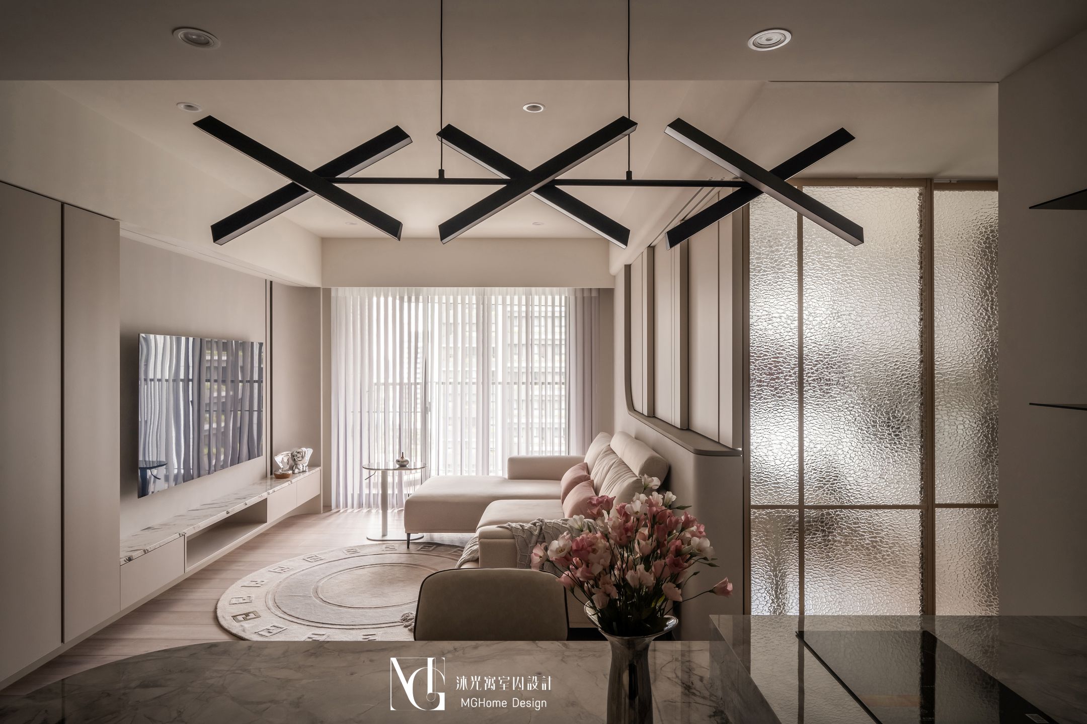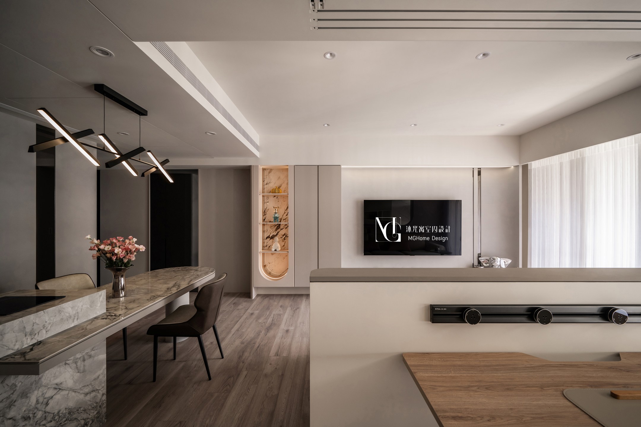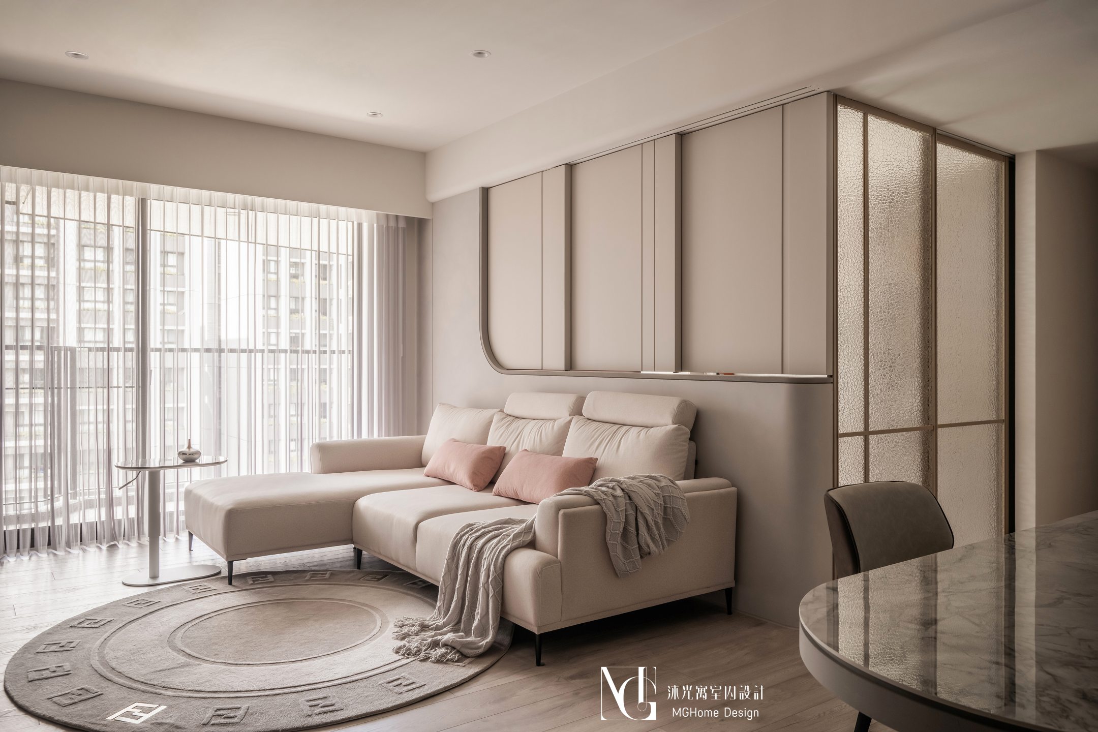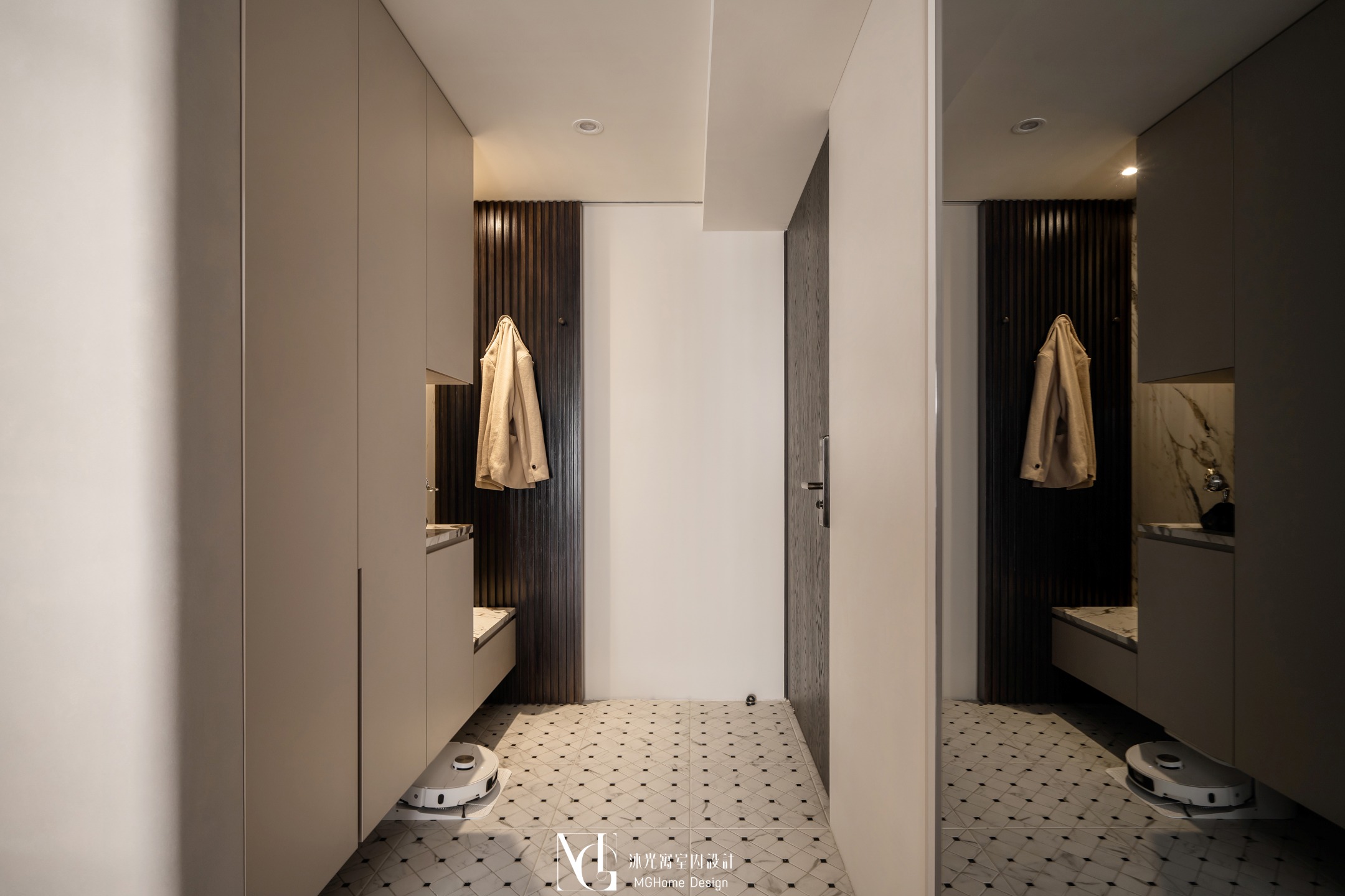 玄關地磚為了符合整體設計更換為帶有石紋的法式磚,並與壁面的薄板相互呼應,全室的奶油色調讓回到家的業主有種放鬆的感覺,而搭配薄板與反射的鏡面及鍍鈦,提升了空間的精緻感;L型的中島餐桌增加了電器的收納也讓餐廳不再單調,適合的主燈既配合整體風格也可在生活中依需求調整;展示區域加上了弧形與條燈效果成為了記錄生活點滴的絕佳位置。
