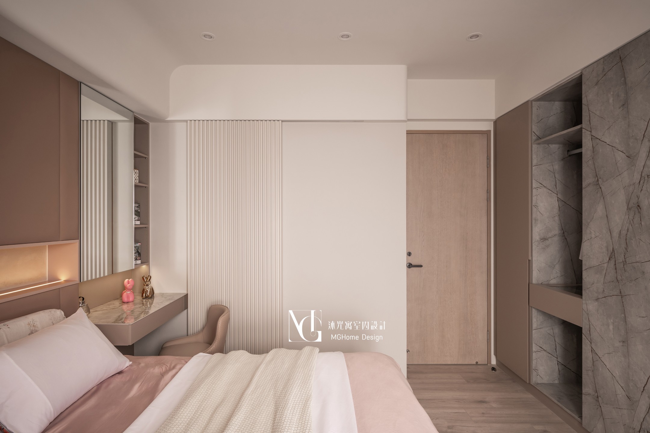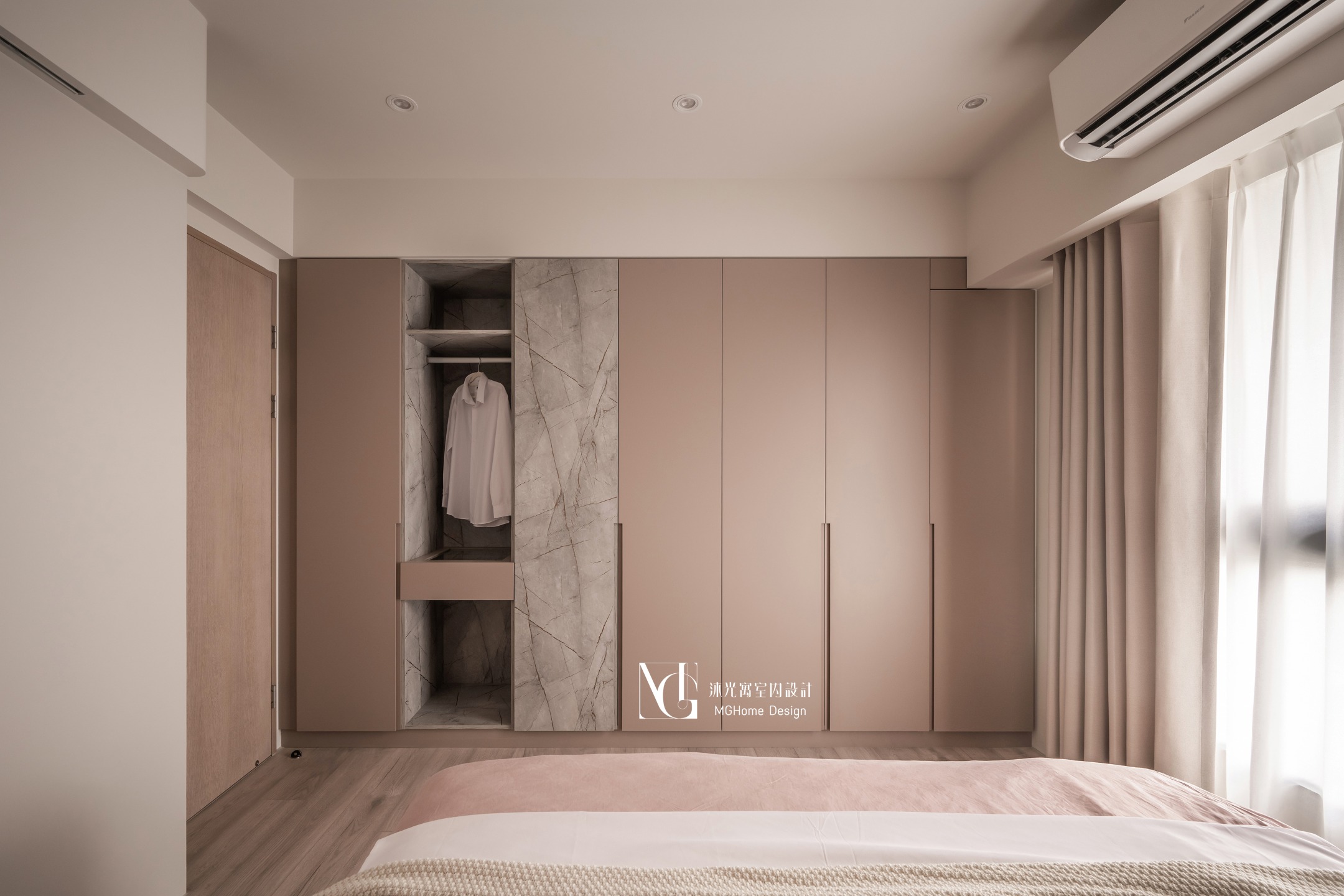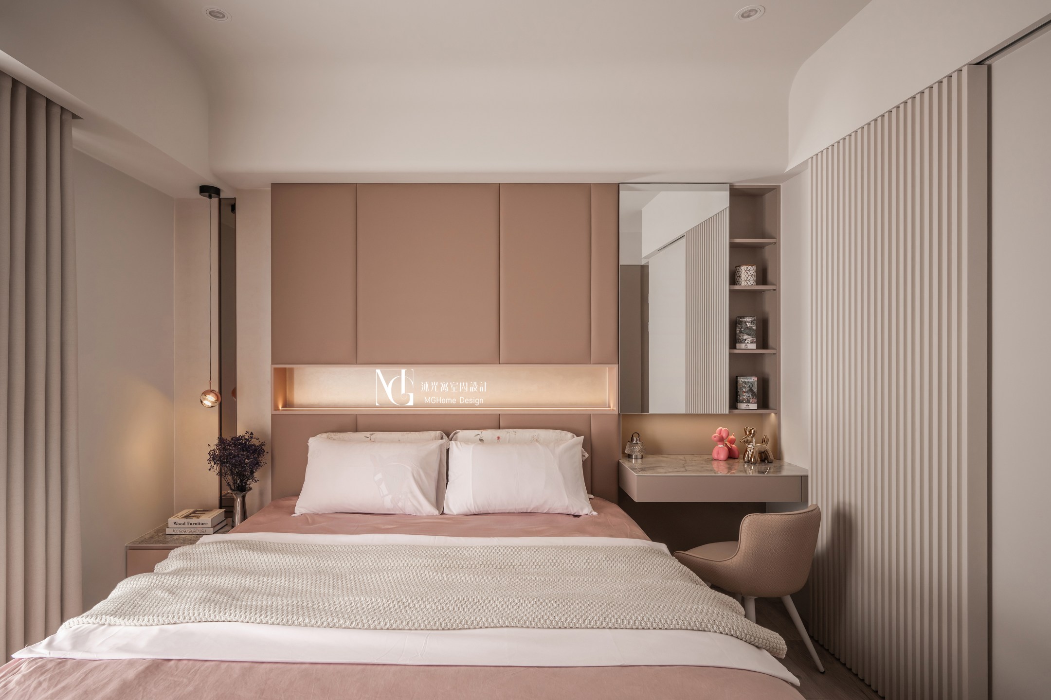 主臥選用更深一階的奶茶色營造臥室的溫暖感,開放的吊衣空間讓外套不再無處安放,搭配玻璃檯面的飾品抽讓選擇一目了然,床頭的造型繃布及特殊塗料搭配吊燈與條燈讓空間不單調。