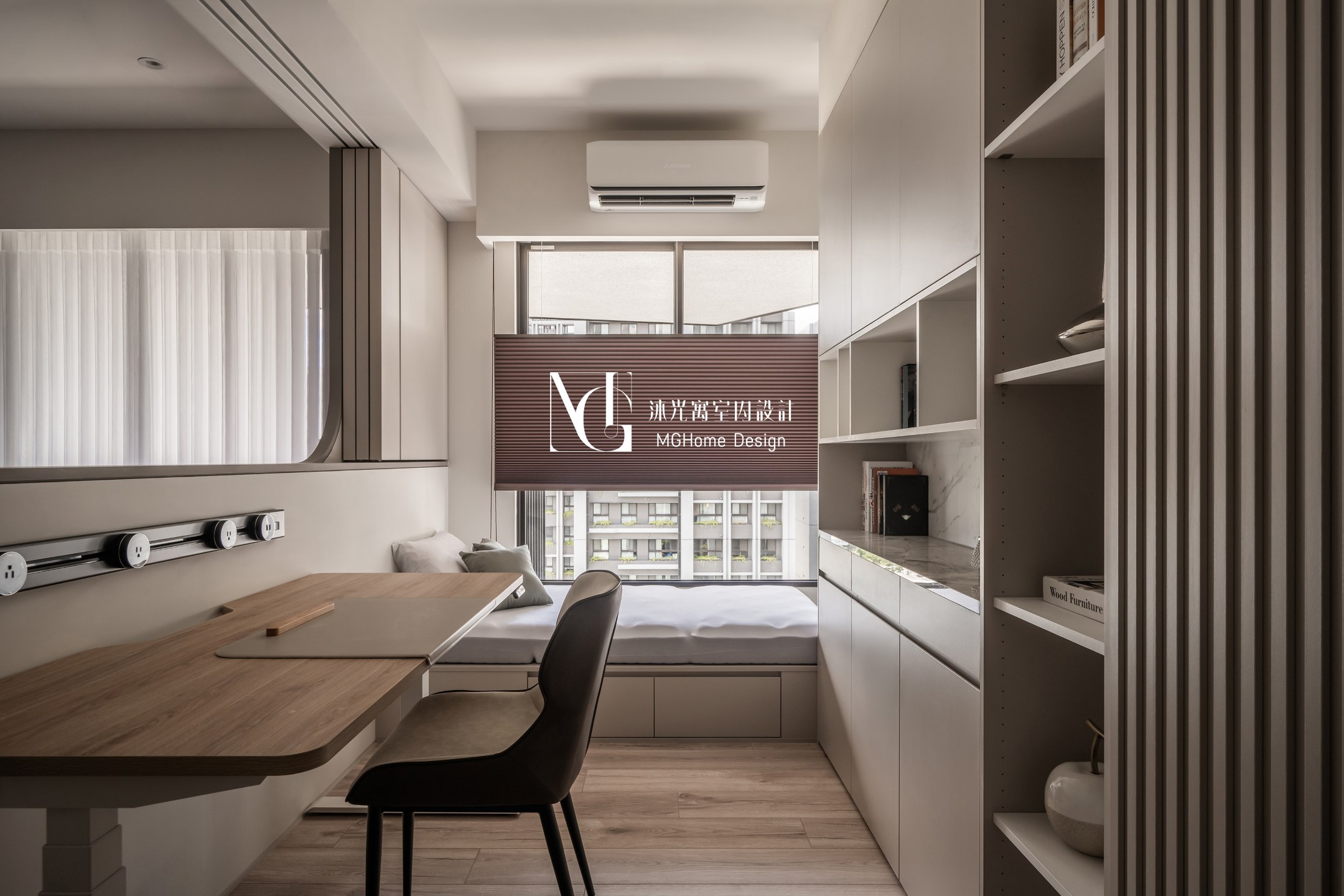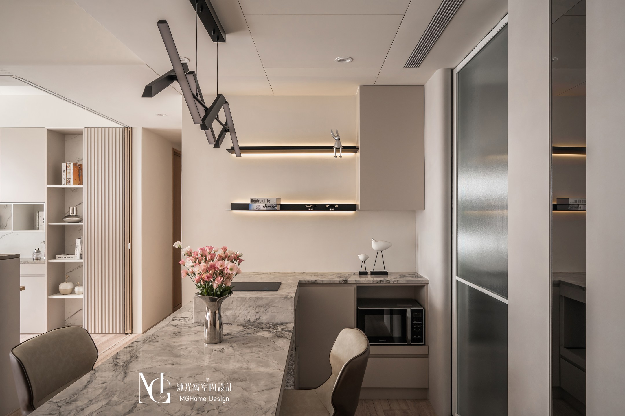 半開放式的書房利用跳色與不同的門片造型改變了“書房”的既定印象,而選擇用石材的系統板,讓空間在開放的狀態下也可以融入公區的設計;將門片關起後即可成為暫住的客房,並選用透光不透影的玻璃達到兼顧光線穿透性的同時也顧及使用者的隱密性。